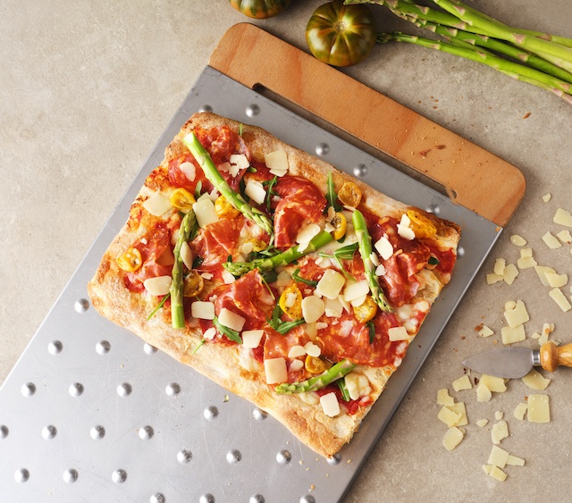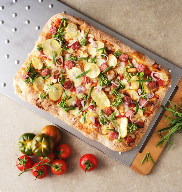 Artisanpizza med krispig botten och färska toppings från lokala producenter bakad i stenugn på Scrocchiarella-pizzabotten.